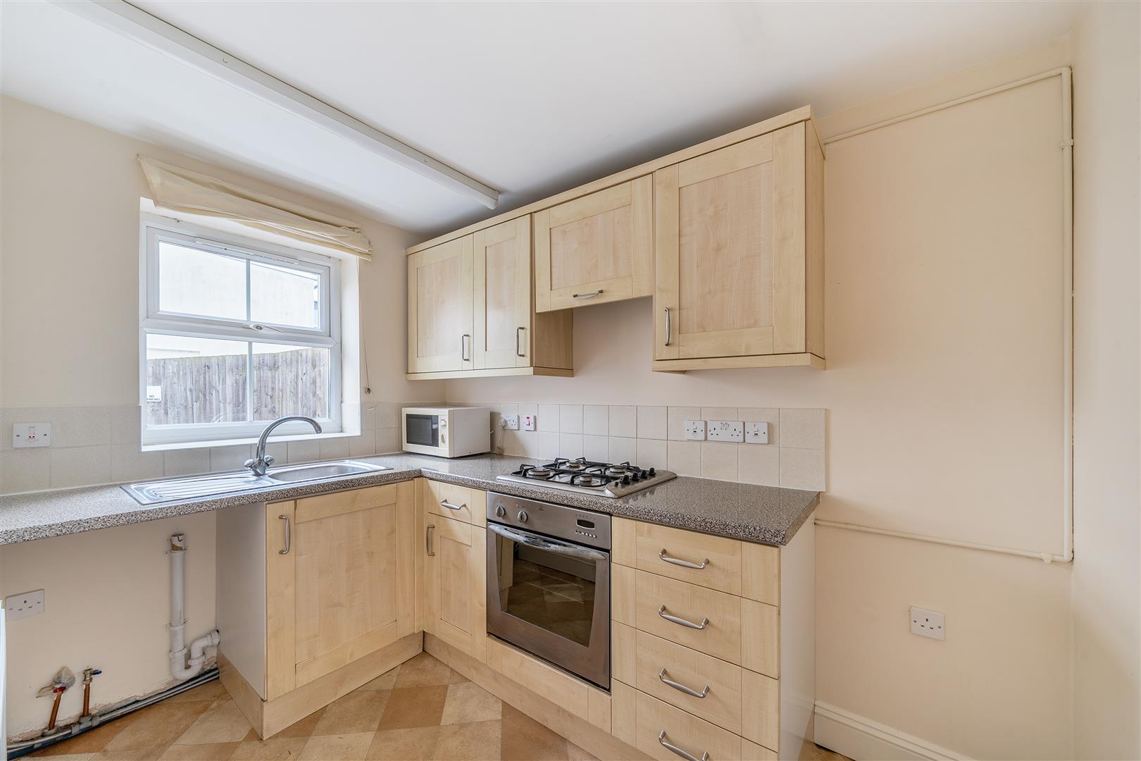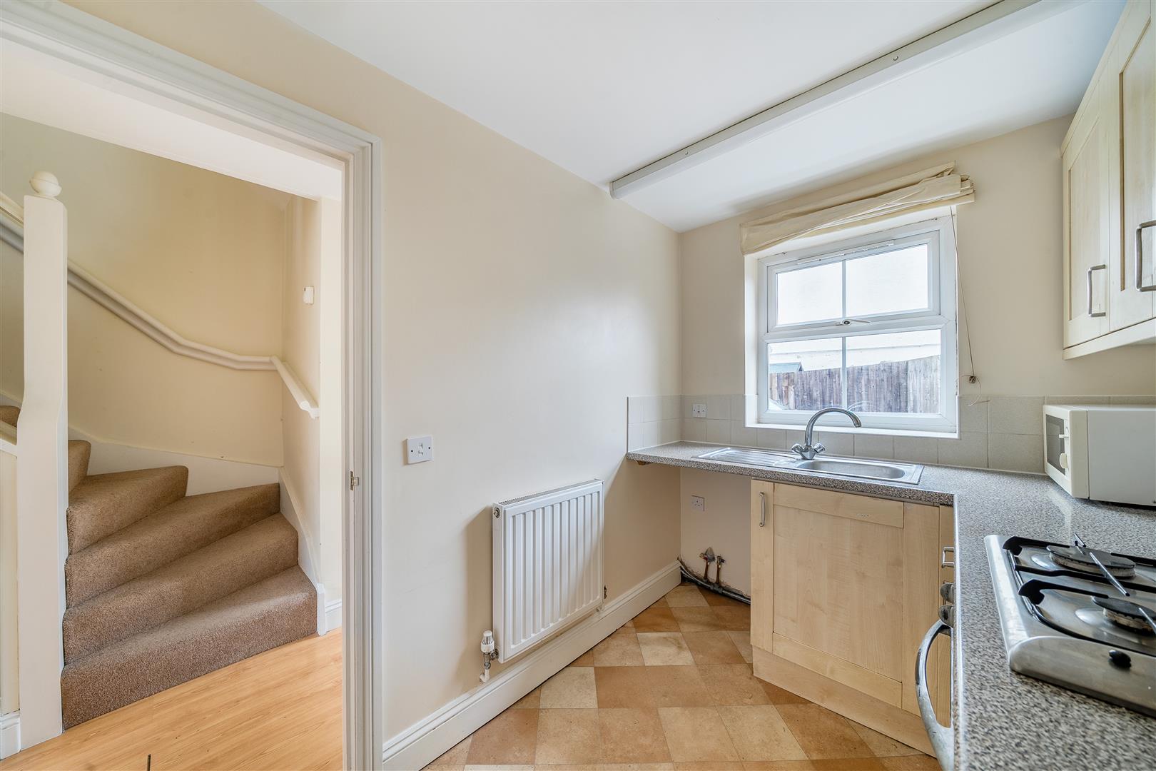 Entrance hall into sitting room with laminate flooring, decorative fireplace and sliding patio doors opening onto the rear garden. Fitted kitchen with oven and gas hob, space for a fridge/freezer and washing machine. .