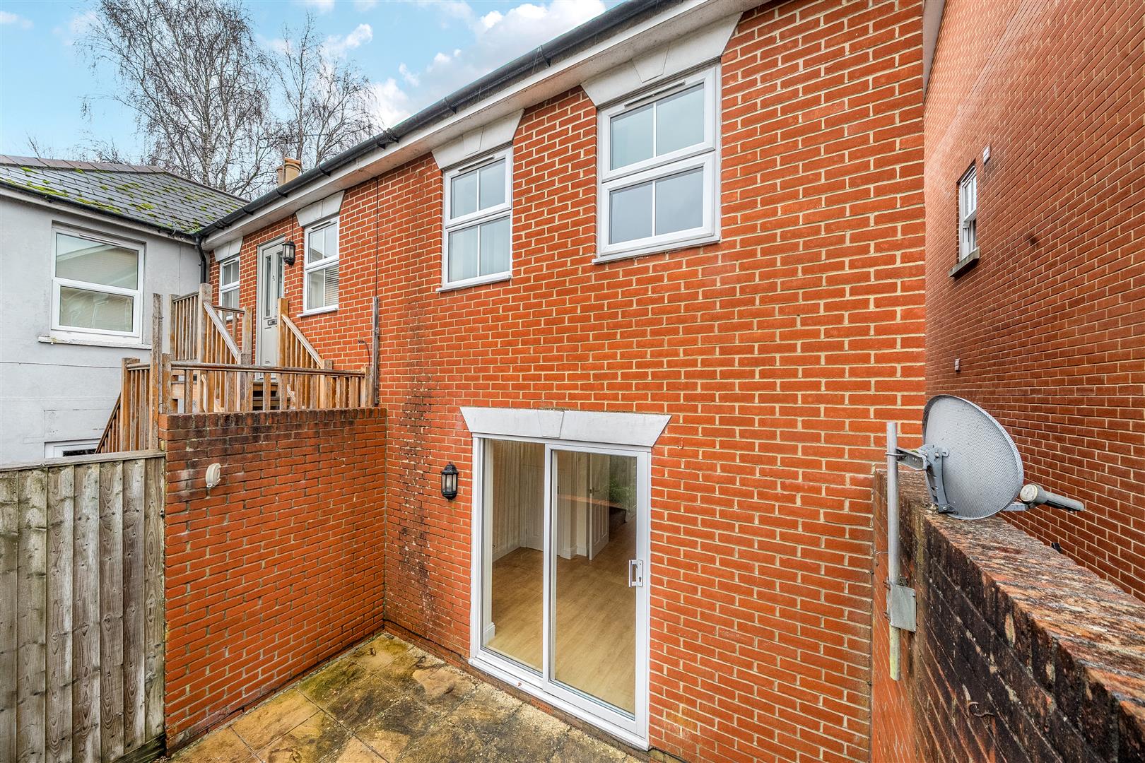 Outside; enclosed rear garden with paved patio area.