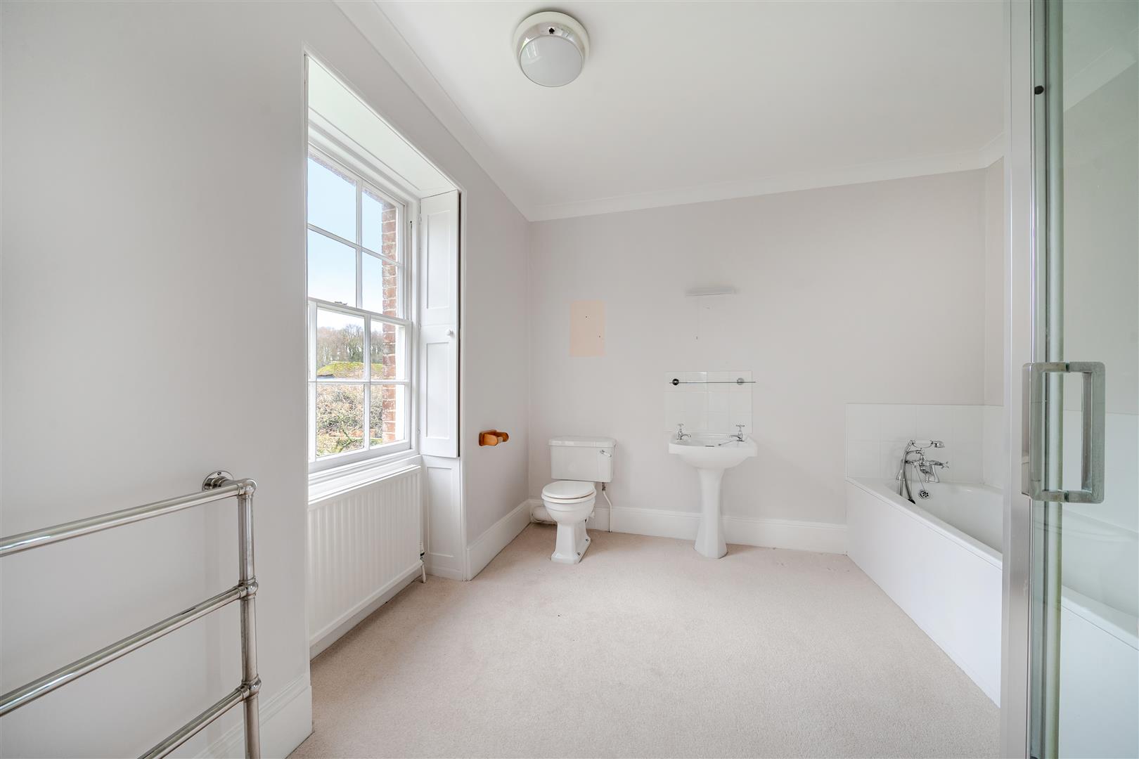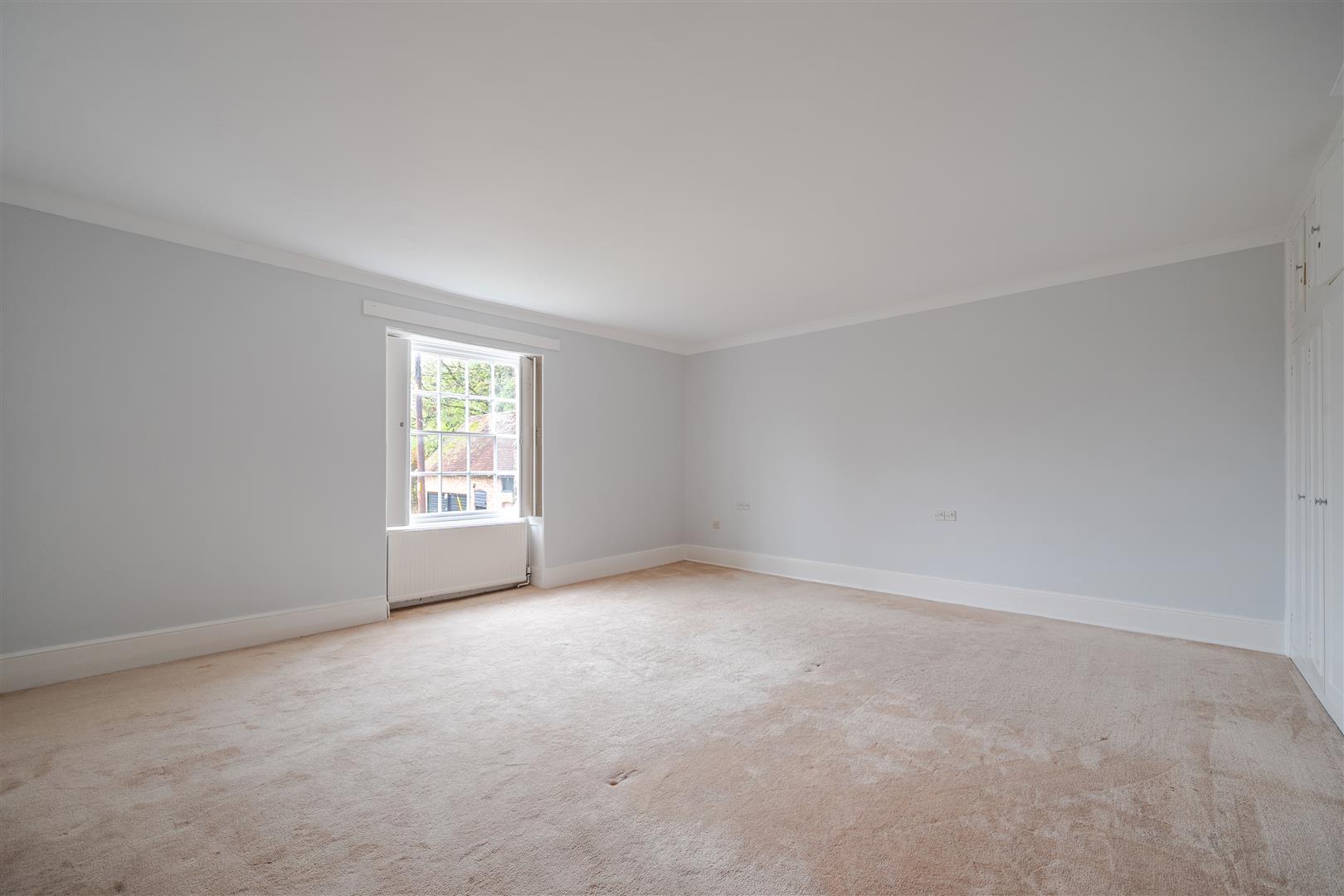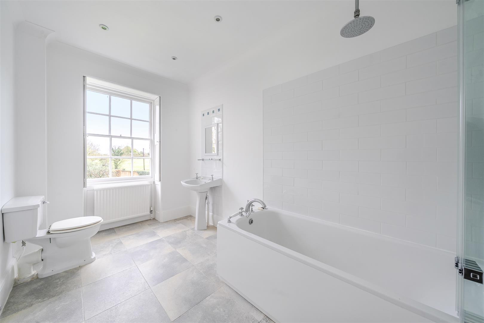 The second bedroom, similar in size to the primary bedroom, also features large windows with functioning original wooden shutters. At the rear of the first floor, there is a recently renovated modern family bathroom that includes a full-sized bath with a large thermostatic shower. The final bedroom on the first floor is situated at the rear of the property, with windows overlooking the rear courtyard garden, tennis court, and surrounding outbuildings.
