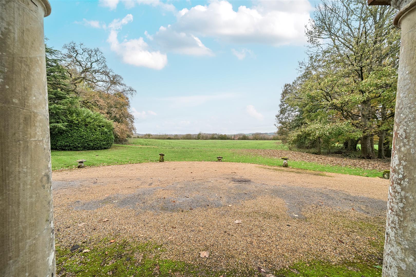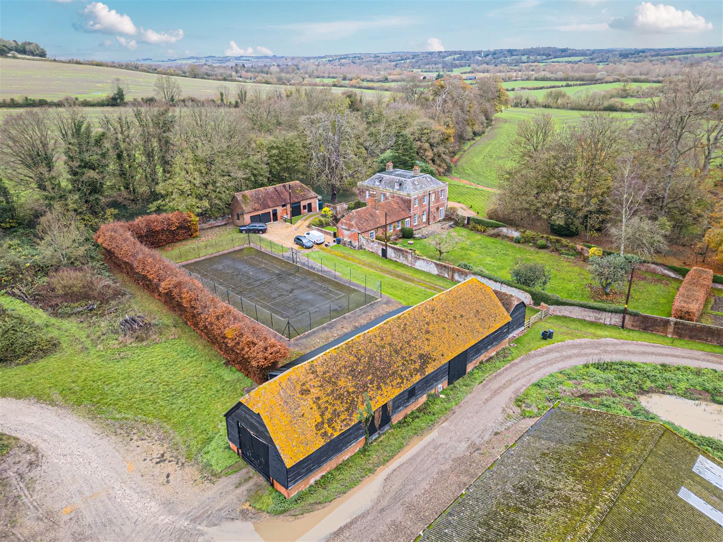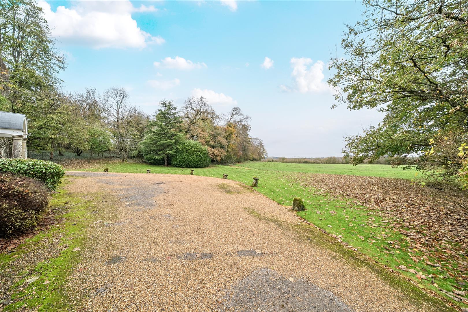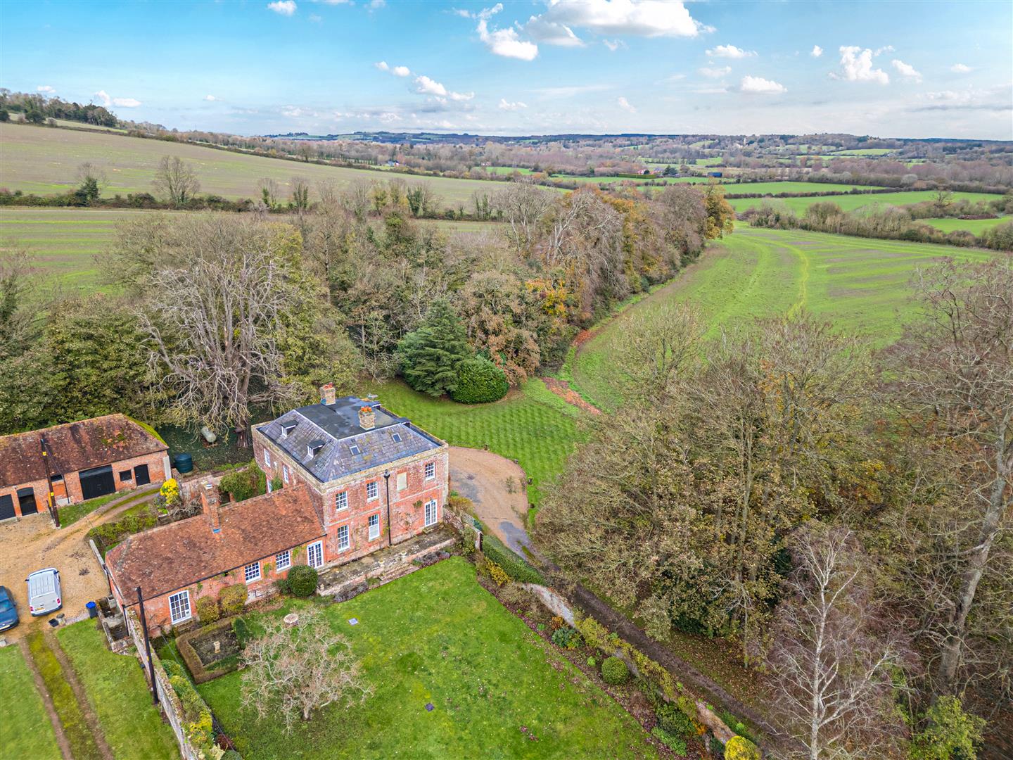 The property is accessed via a long, tree-lined private driveway that leads to the front of the house. There is ample parking space available by the front, and the driveway also extends around to the rear of the property for more discreet parking options.