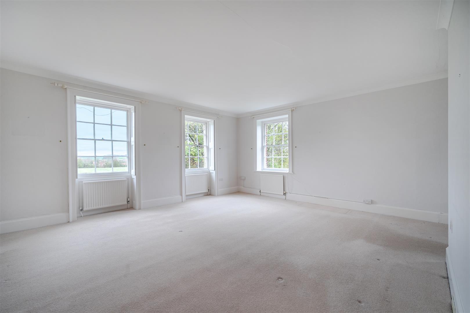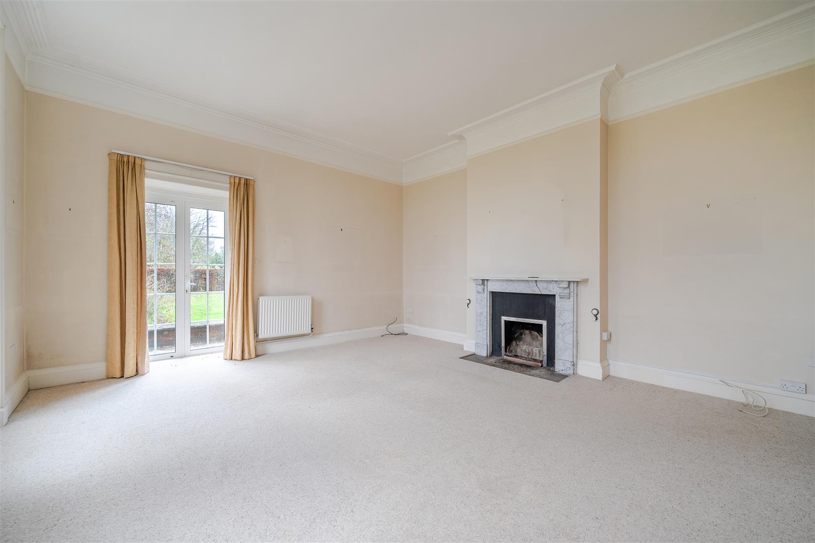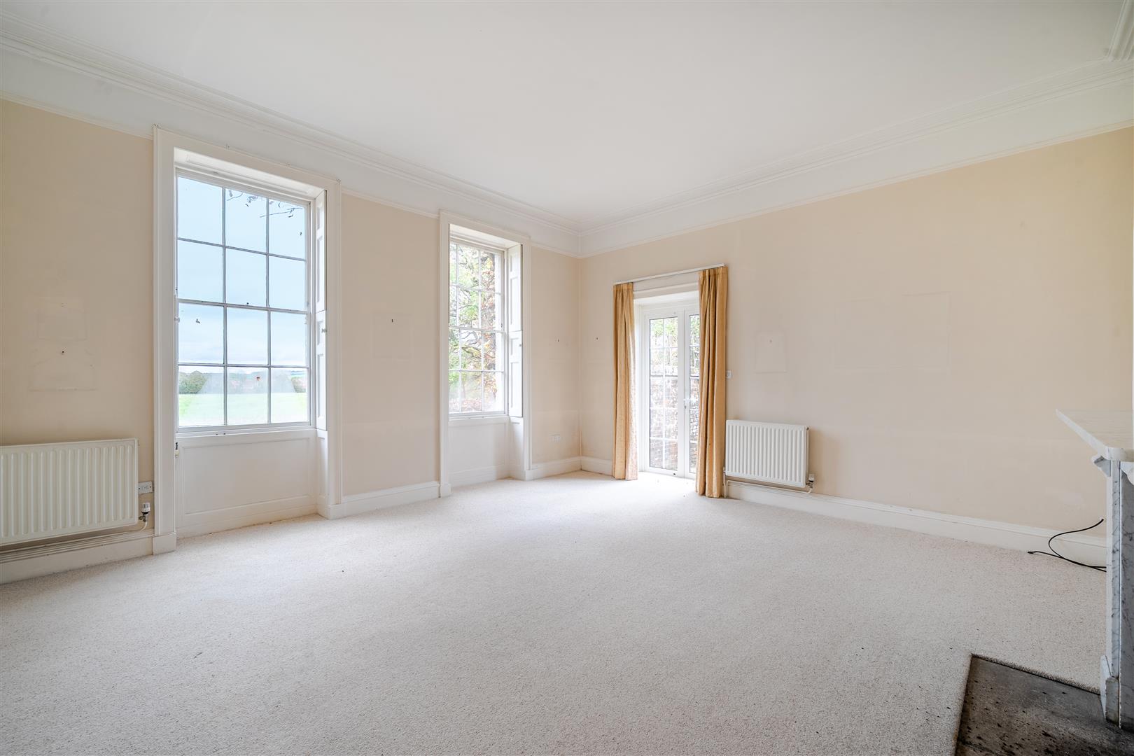 Upon entering the property, you are welcomed by a wide, open entrance hall featuring a large staircase on the right-hand side. Doors on either side of the hallway lead into the formal reception rooms. The reception room to the right of the entrance is bright and airy, thanks to the large sash windows that overlook the front driveway and surrounding farmland. This room also has double French doors that open onto the terrace, and it features original cornicing along with a working open fireplace complete with a marble surround.