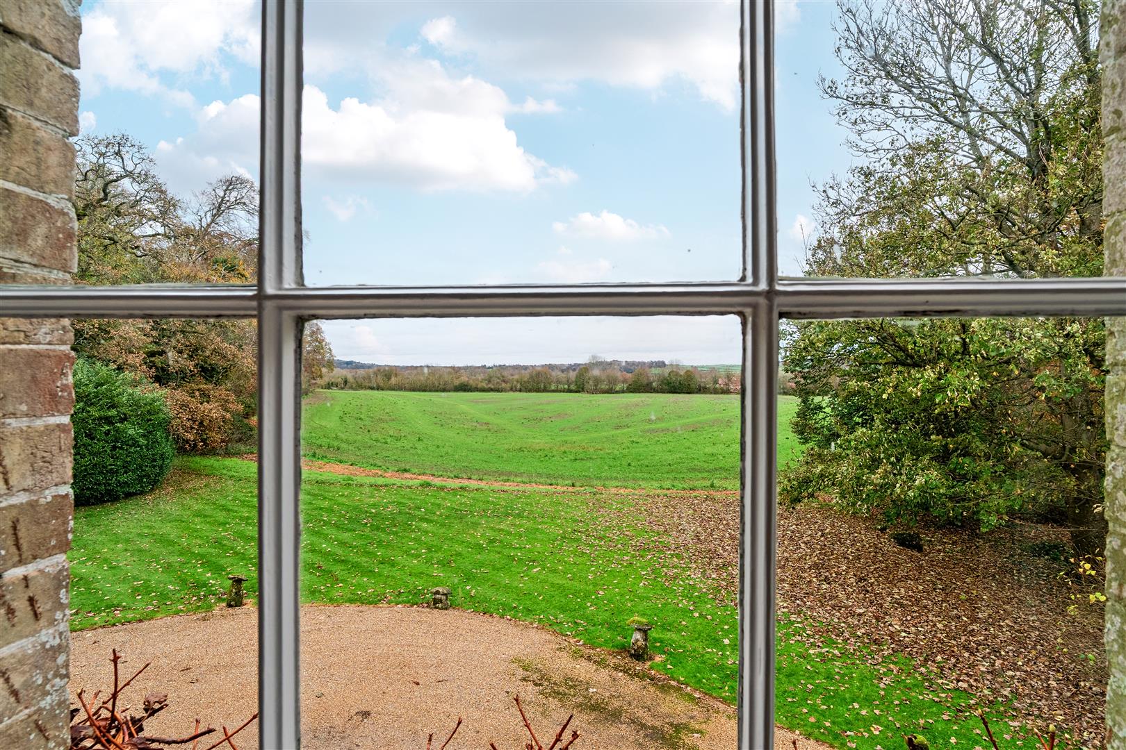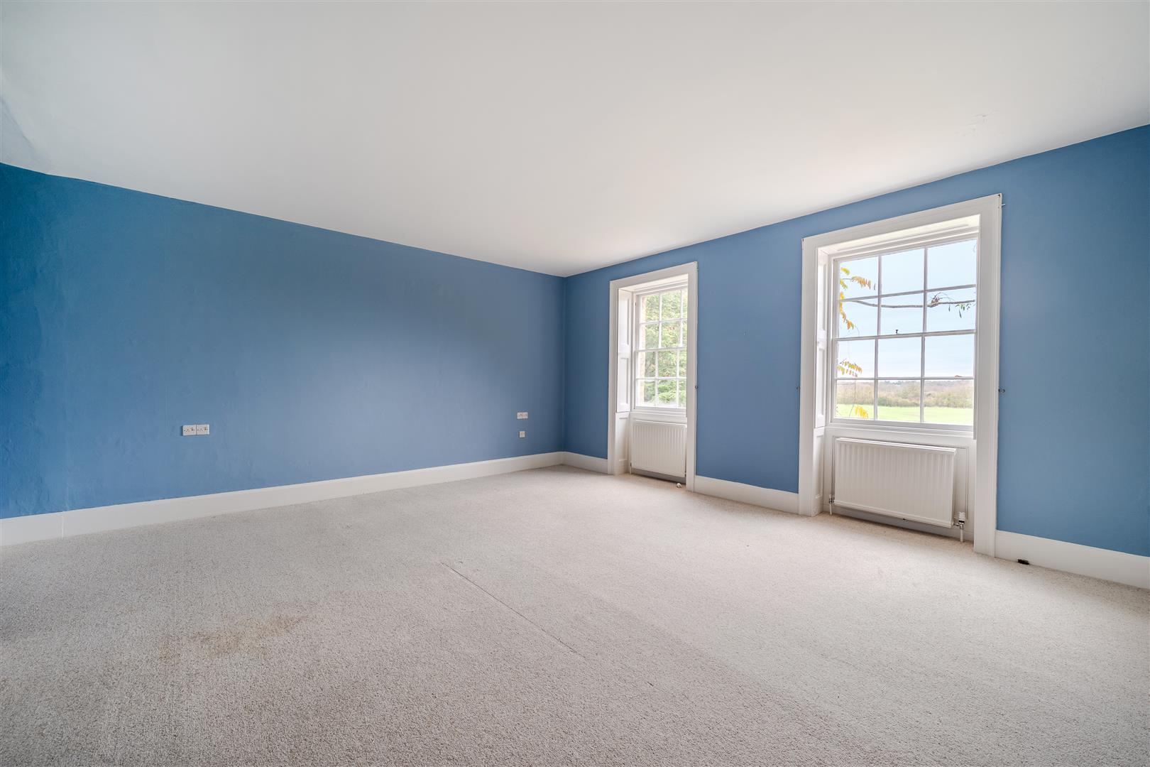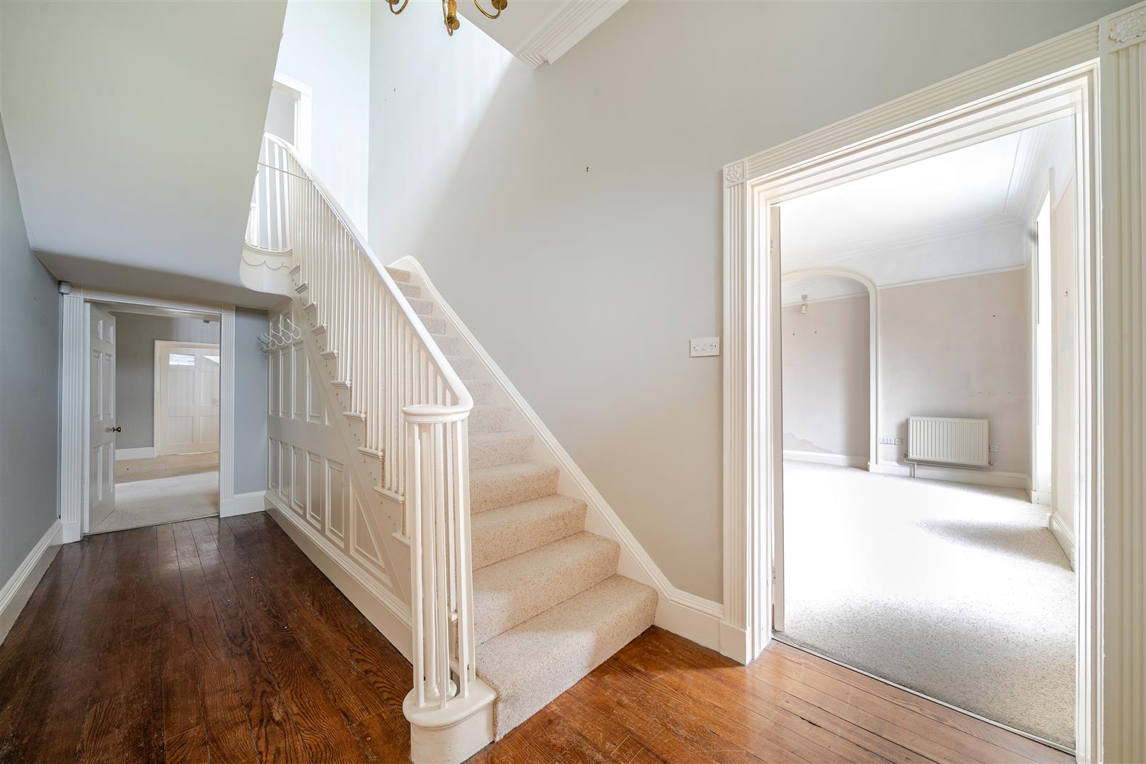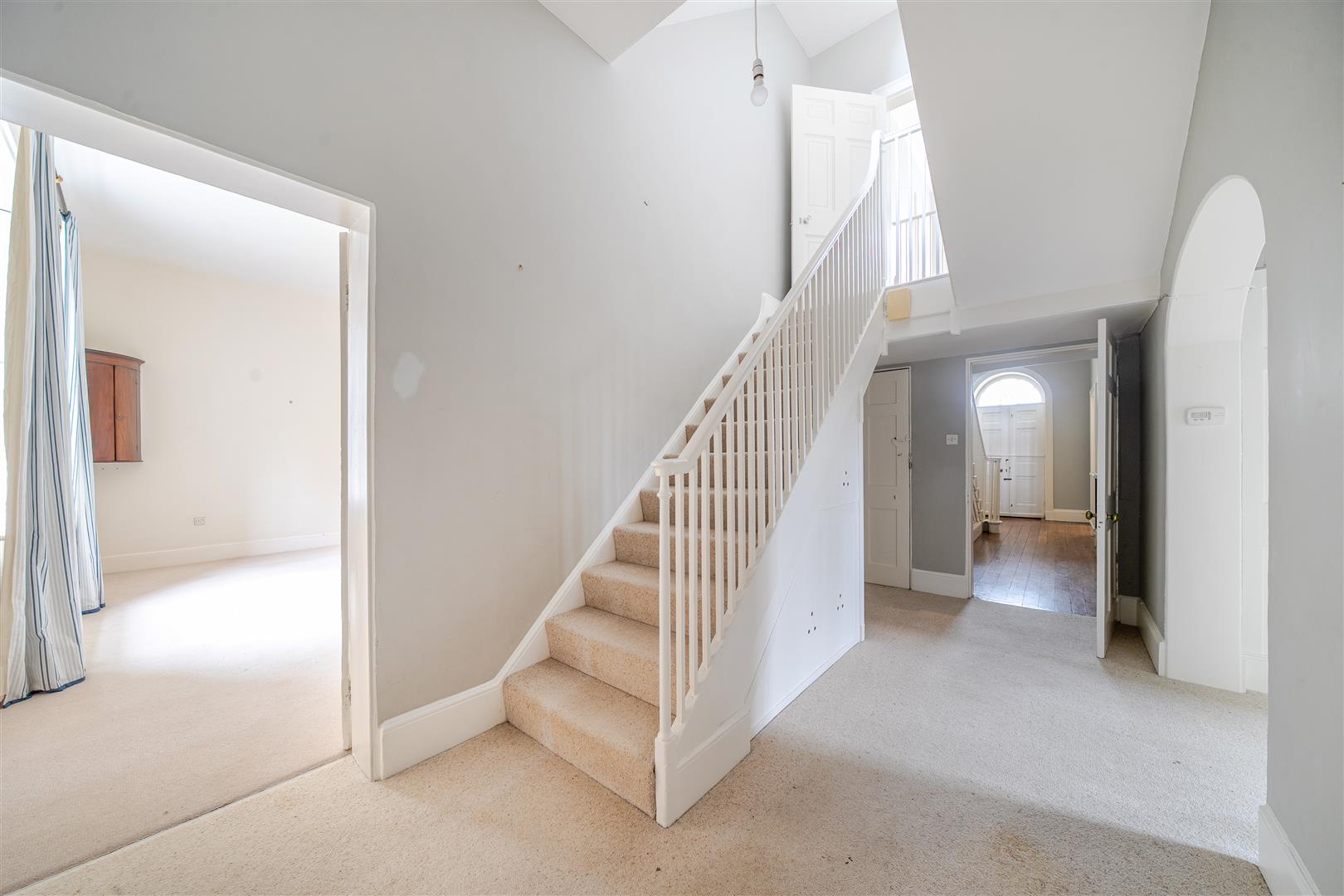 Upon entering the property, you are welcomed by a wide, open entrance hall featuring a large staircase on the right-hand side. Doors on either side of the hallway lead into the formal reception rooms. The reception room to the right of the entrance is bright and airy, thanks to the large sash windows that overlook the front driveway and surrounding farmland. This room also has double French doors that open onto the terrace, and it features original cornicing along with a working open fireplace complete with a marble surround.