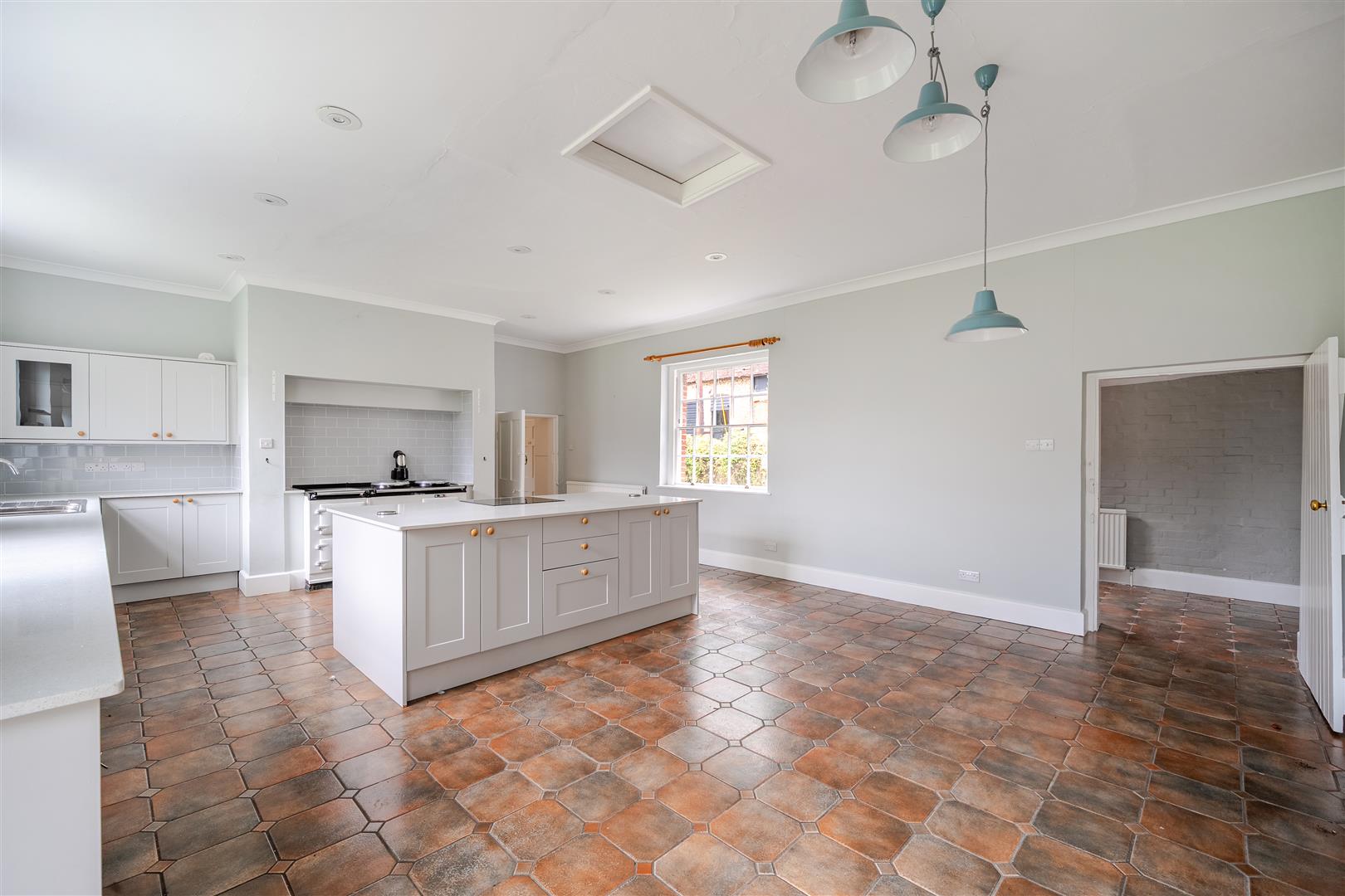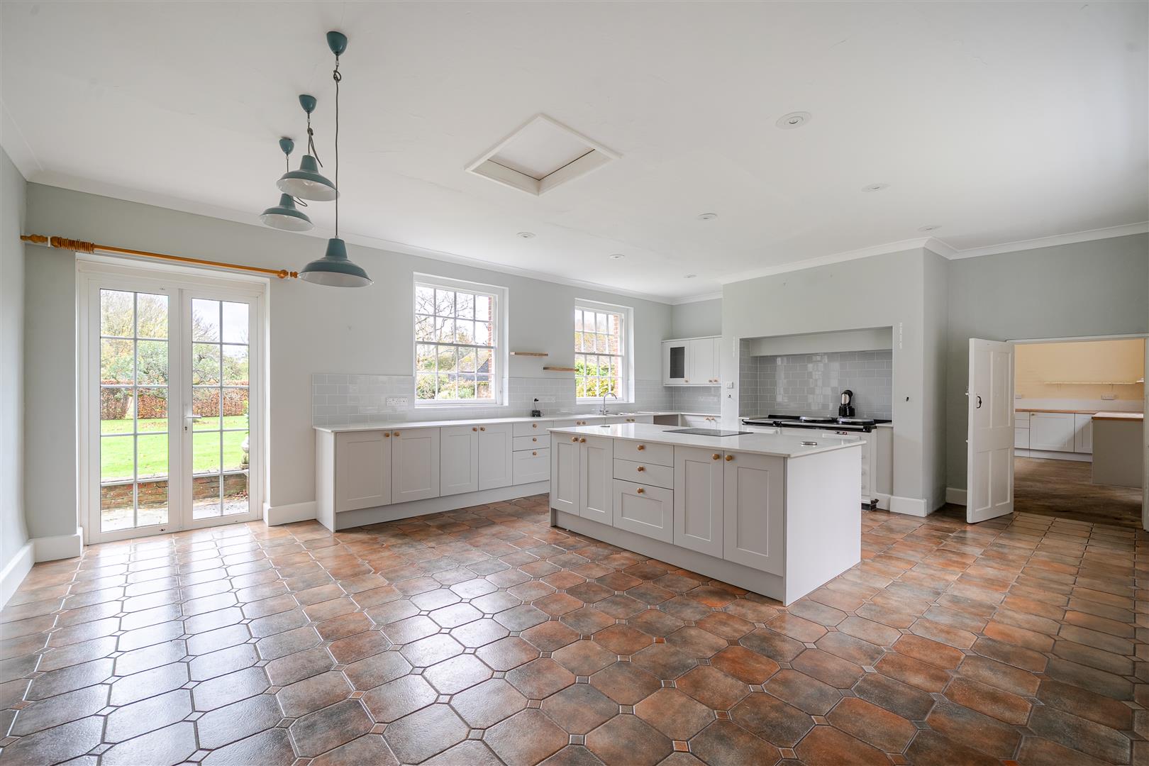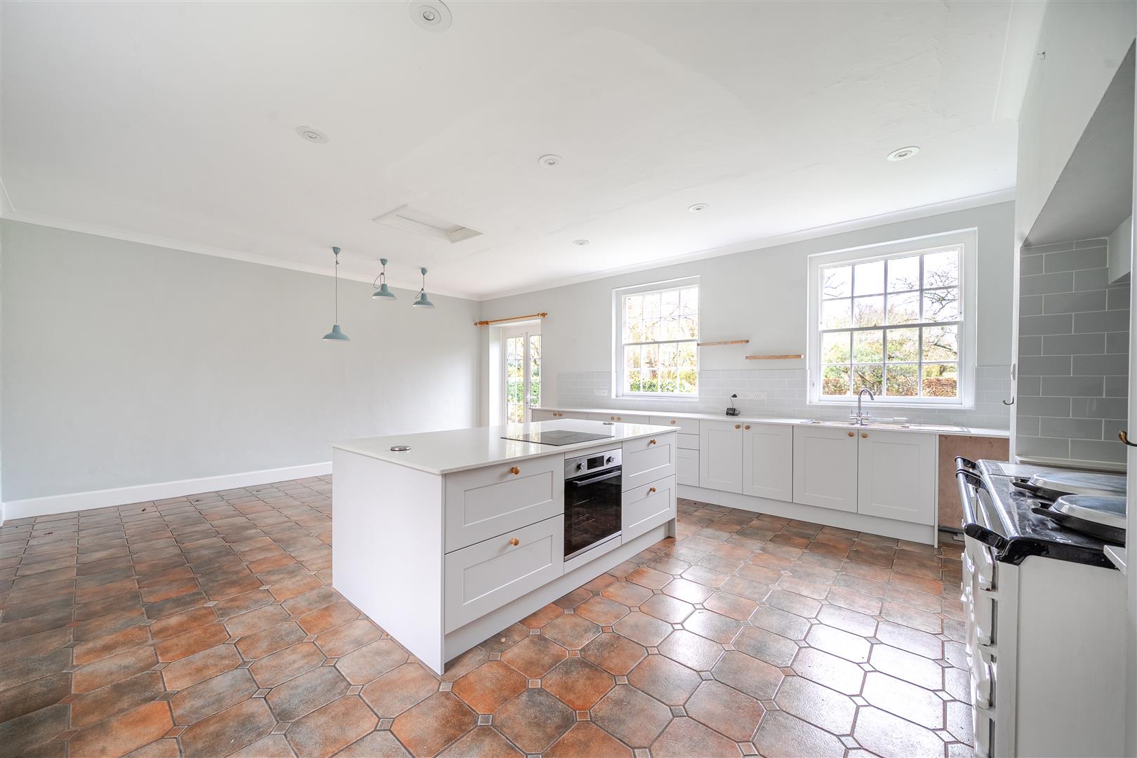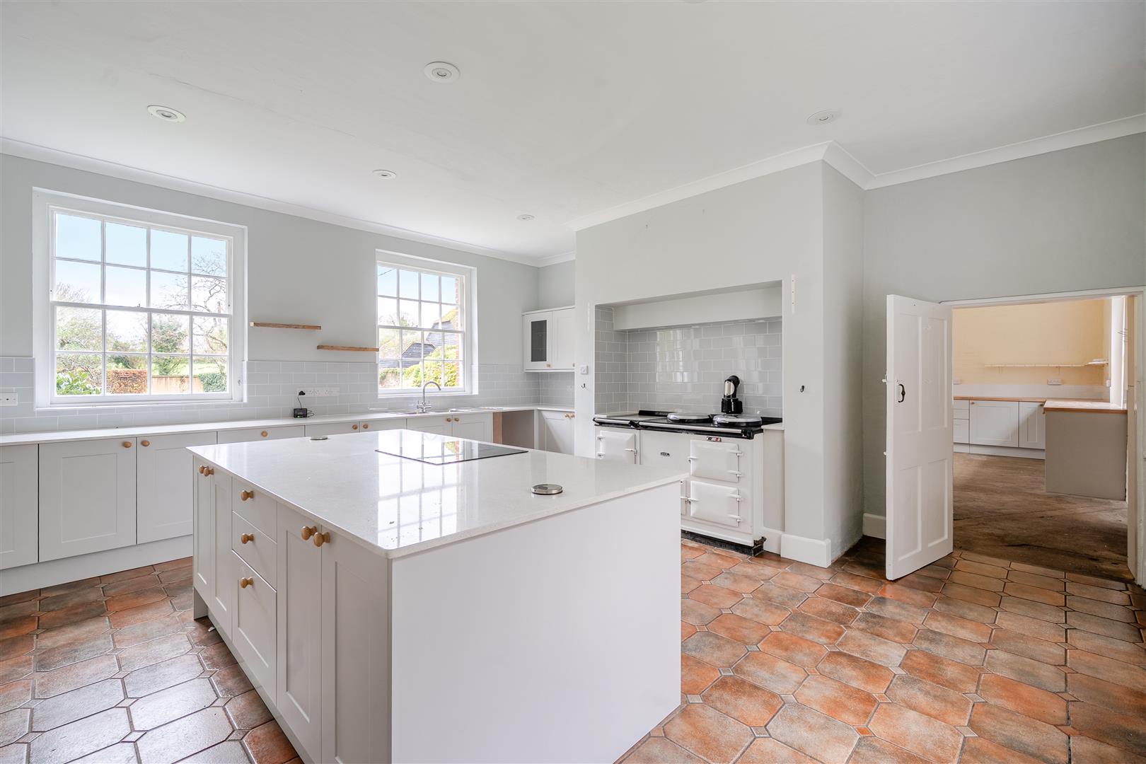 At the rear of the property, the expansive kitchen has been recently updated. It features faux white granite worktops, a full-size two-plate AGA with a warmer and hotplate accessory, and a separate induction hob and electric fan oven situated on a large kitchen island. The spacious kitchen provides ample room for a full-sized dining table and benefits from double French doors that lead out onto the southern terrace and garden, as well as large sash windows on both sides that create a bright and open space. Leading from the kitchen is an exceptionally large utility room that provides space and plumbing for both a washing machine and tumble dryer. The utility room also includes space for a large pump room, featuring modern plumbing and a hot water cylinder.