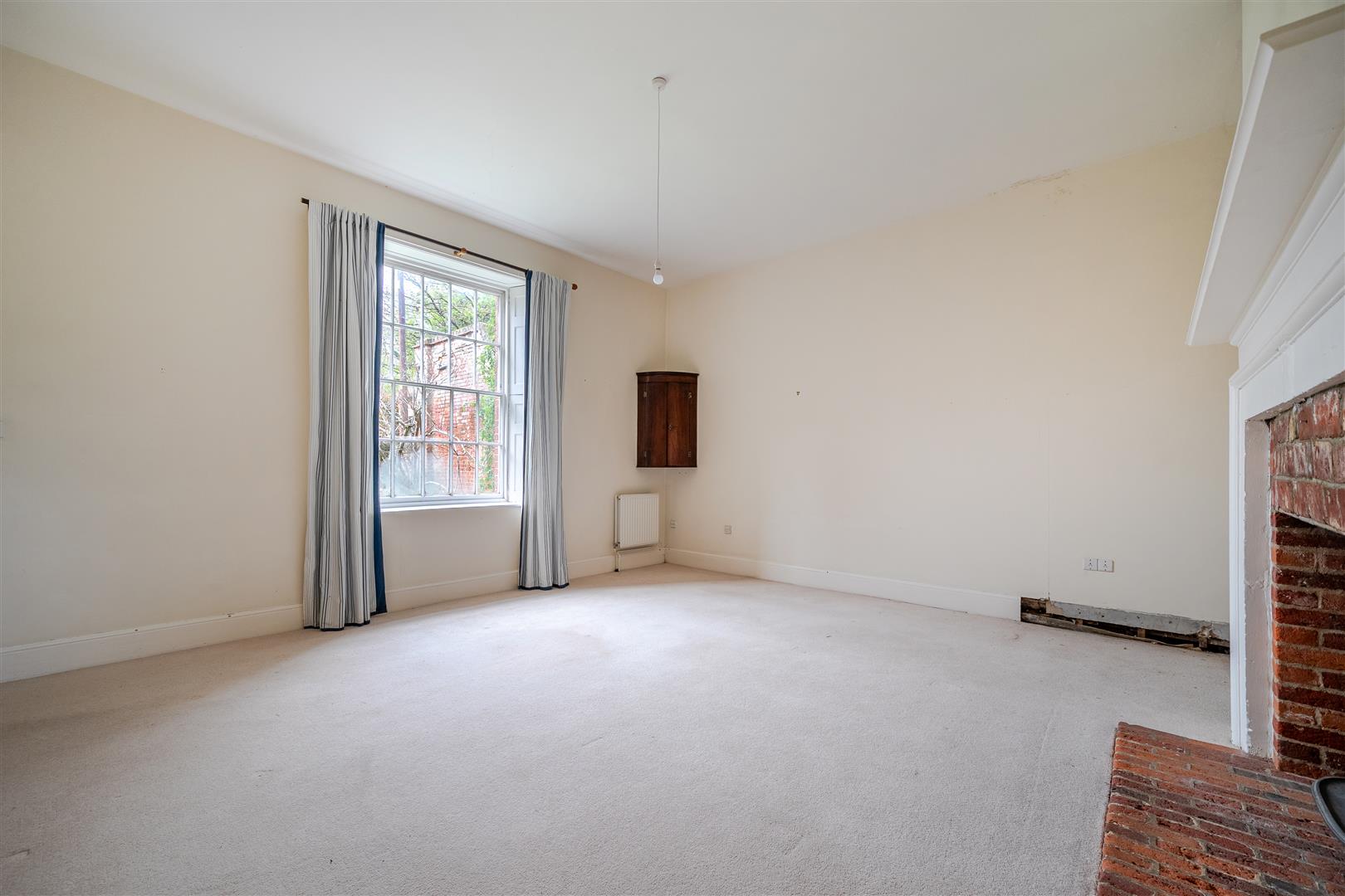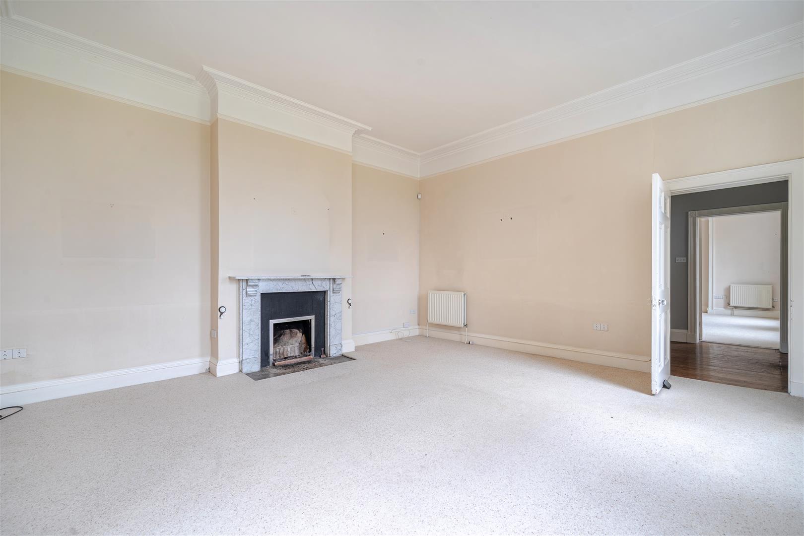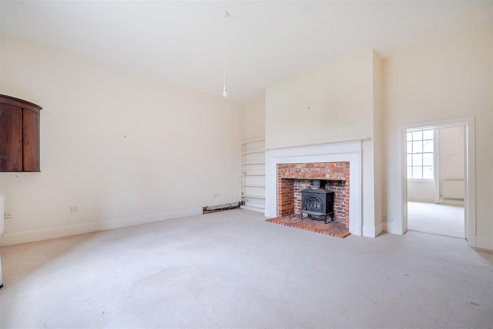 The second front reception room includes an open fireplace with an ornate carved wood mantle. This room leads through to the formal dining room, which boasts a large working log burner with a brick surround.