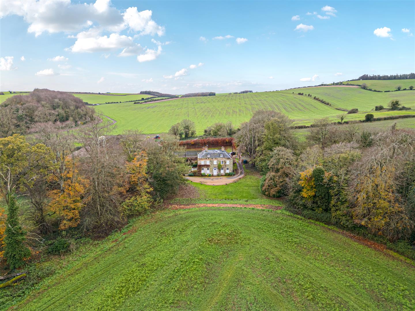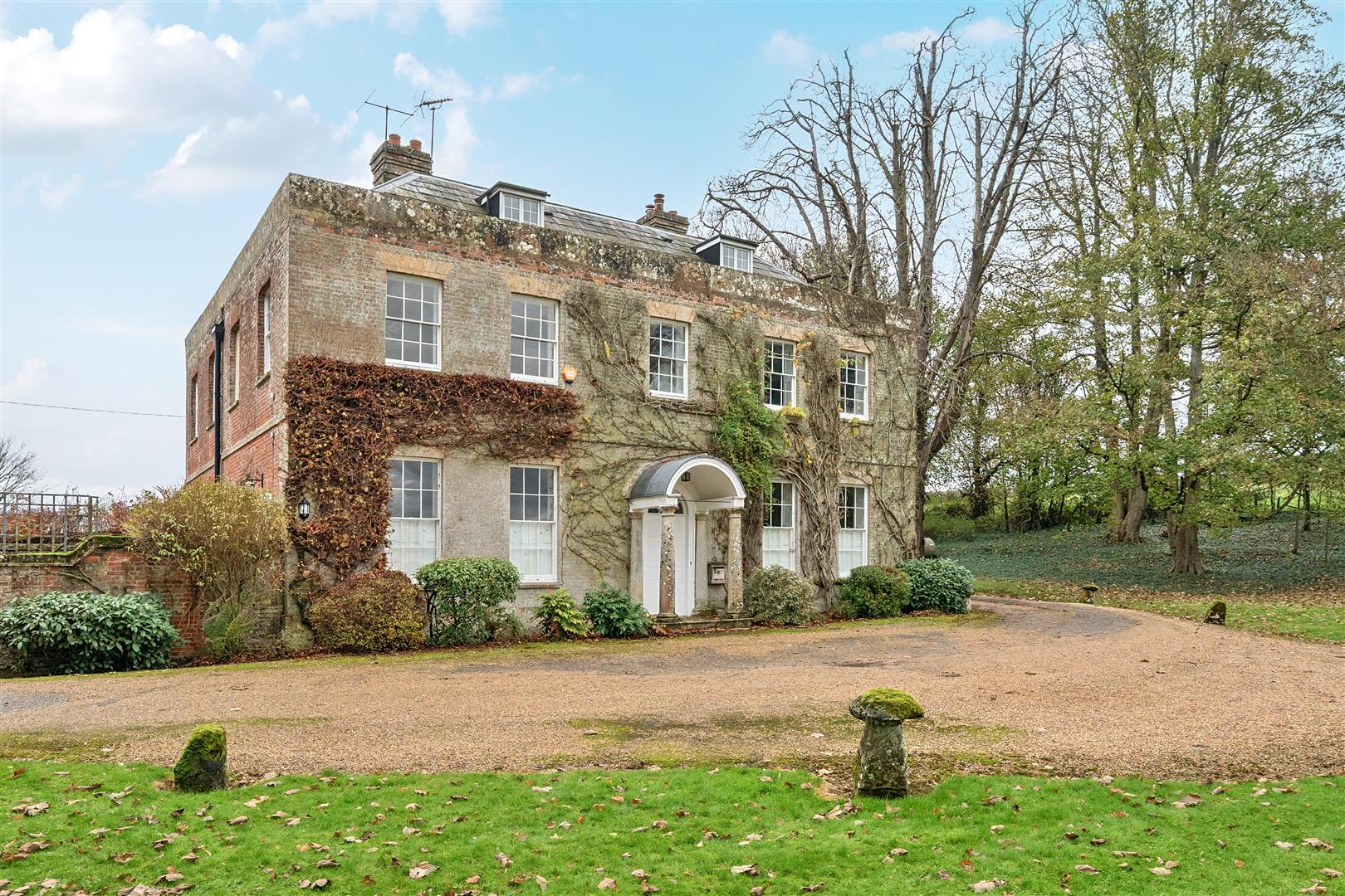 Surrounded by stunning views of active farmland, Charlton Manor Farmhouse is a Grade II-listed seven-bedroom family home, rich in architectural features. Dating back to around 1830, the property stands out in the landscape with its grand façade under a Welsh slate roof and its central porch adorned with Tuscan-style columns.