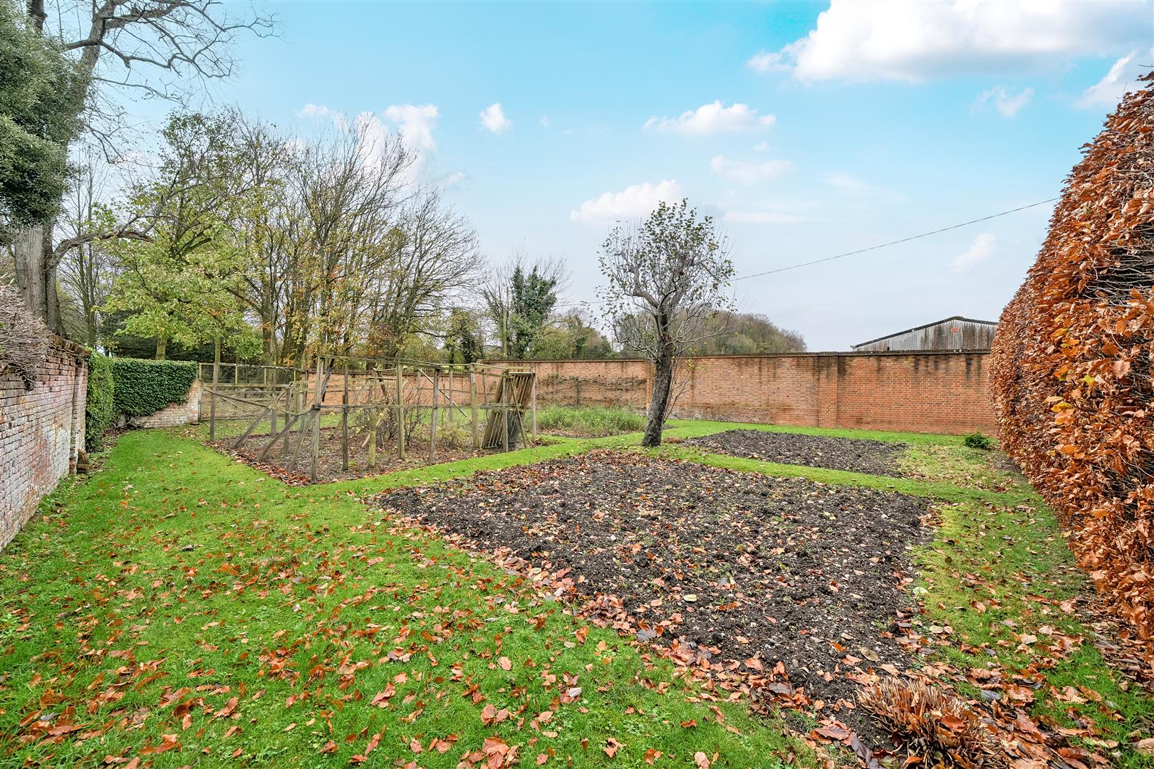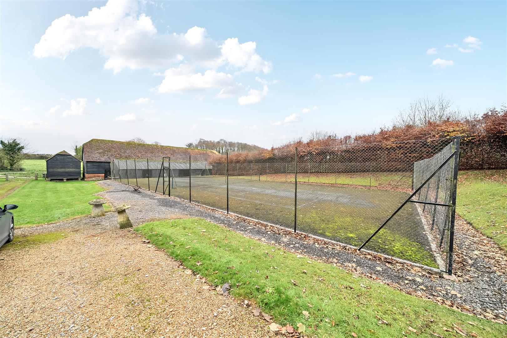 The property features a large walled garden on the southern side of the house, which includes a spacious patio terrace accessible from the main reception room, the snug, and the kitchen. Beyond the terrace, there is a sizable lawn area bordered by extensive flower beds on either side. At the rear of the walled garden, a tall hedge separates it from a well-proportioned vegetable garden that includes four large ground-level patches. Additionally, the rear of the property boasts a full-sized tennis court, easily accessible through a gate from the garden as well as from the rear parking area.