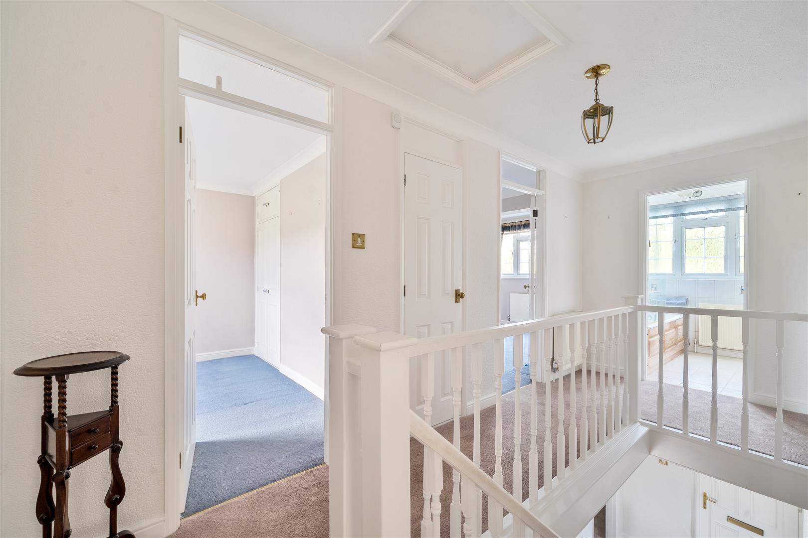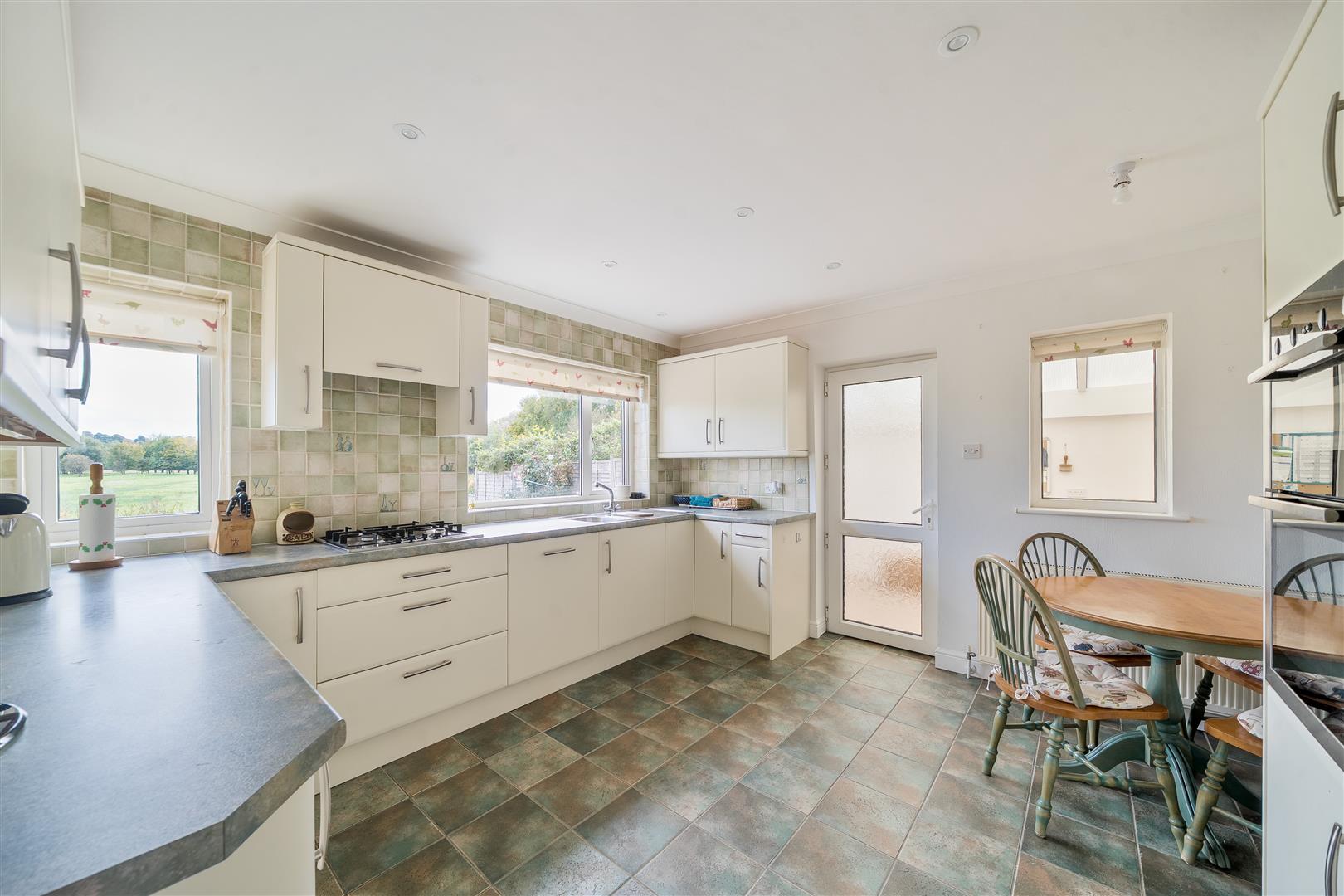 A glazed entrance porch leads to the hallway with two built in cupboards and stairs to the first floor with cloakroom off. The double aspect sitting room has a bay window to the front elevation and double doors with glazed side panels leading to the conservatory which is glazed to all sides and has double doors to the garden. Also off the hall is a dining room with a large window to rear to take advantage of the views. From here a door leads into the kitchen which has a good range of worksurfaces, base and wall mounted drawers and cupboards, stainless steel sink with mixer tap, 4 ring gas hob with extractor hood over, double oven, dishwasher, fridge and freezer. The Sun room has a door to the garden and workshop together with a polycarbonate roof giving plenty of light. The workshop has a door from the front garden, range of shelving, a wall mounted Potterton gas fired boiler for heating and hot water and a door to the double garage which has a sink unit with cupboards above and below together with space and plumbing for a washing machine.
