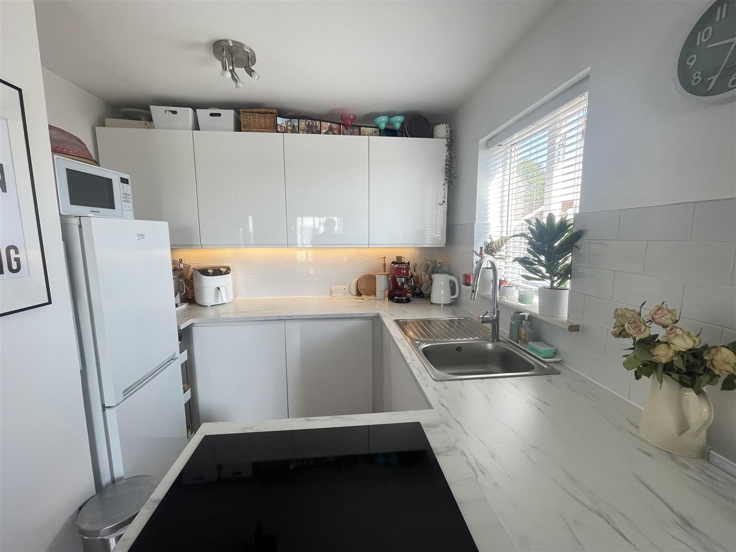 KITCHEN AREA; Fitted with white fronted base and wall units with work surfaces over, wood effect floor, integrated electric oven, induction hob and dishwasher, space/plumbing for washing machine, space for fridge/freezer, sink and drainer under window to front with far reaching views towards Old Sarum.