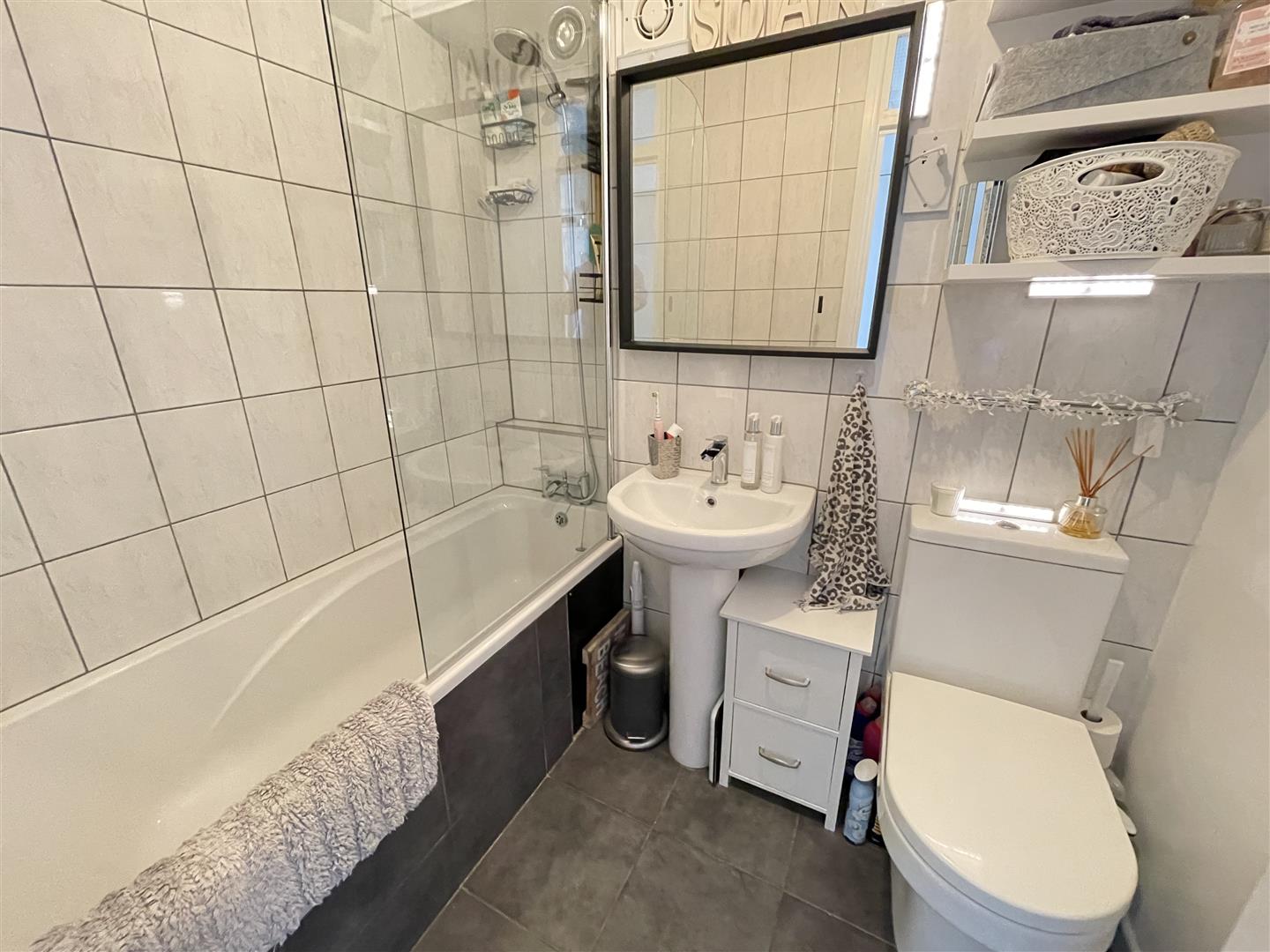 Fitted with a white suite comprising panelled bath with shower and shower screen, pedestal wash hand basin, low level WC, shaver point, part tiled walls, extractor, tiled floor, fitted shelving.