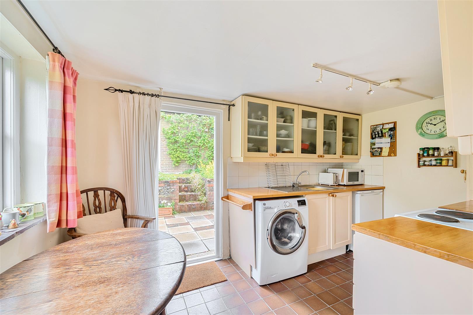 Work surfaces with base and wall mounted cupboards and drawers, display cupboards, space and plumbing for washing machine, cooker space, fridge space, door to garden, quarry tiled floor.