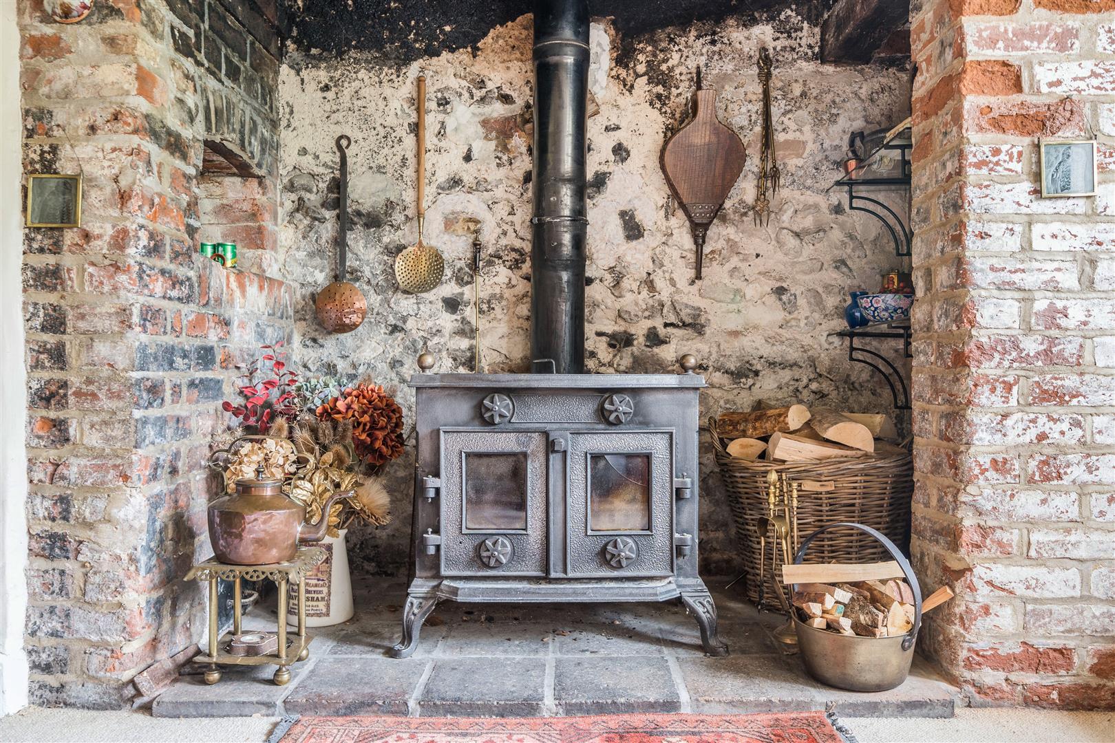 Inglenook fireplace with bread oven to side and woodburning stove, ceiling beams, understairs cupboard.