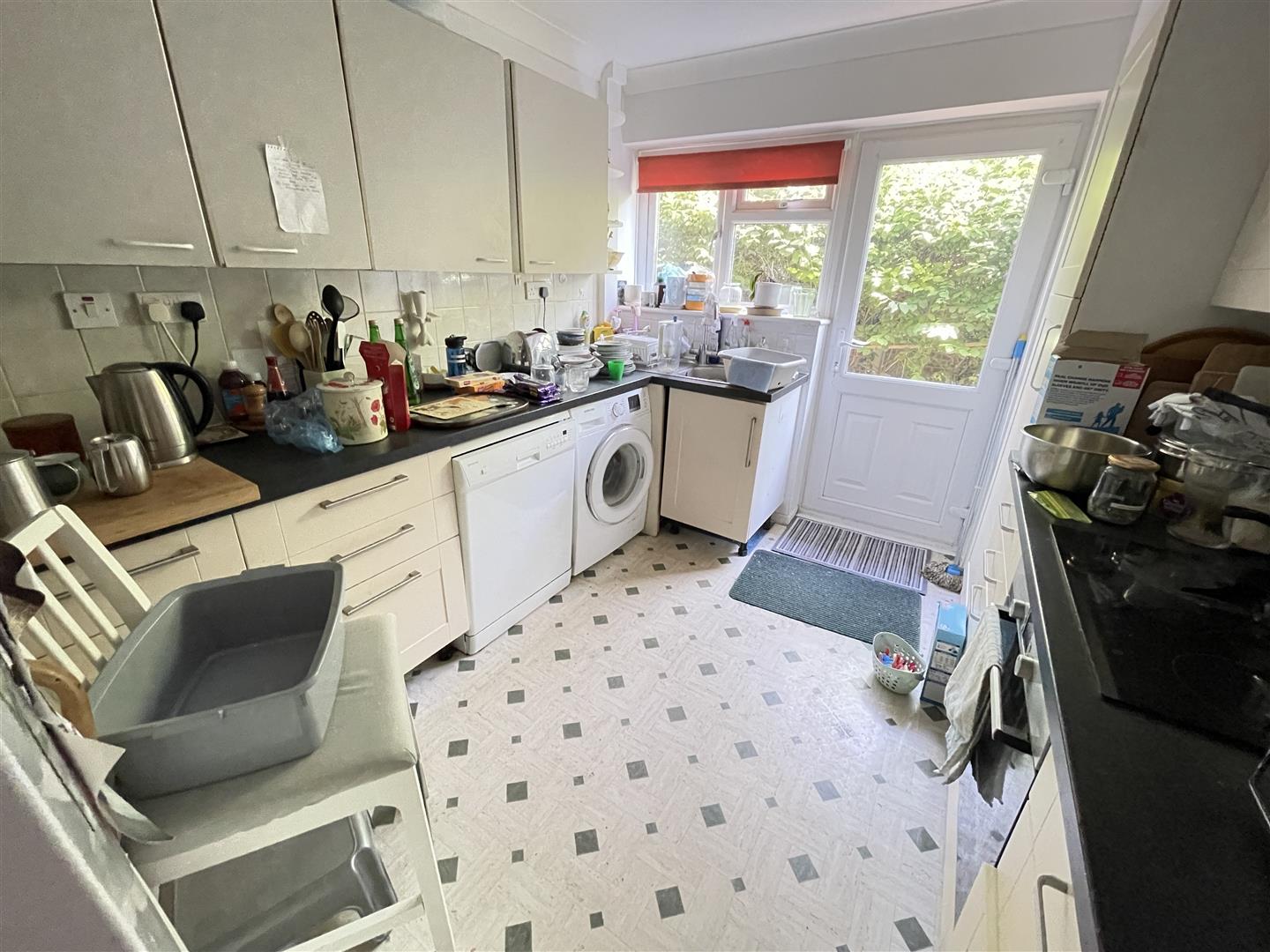 The bungalow is approached via a brick pavior driveway and path leading to the front door. There is a section of lawn, flower beds and shrubs sitting behind a low wall. A side pedestrian gate leads to the rear garden.