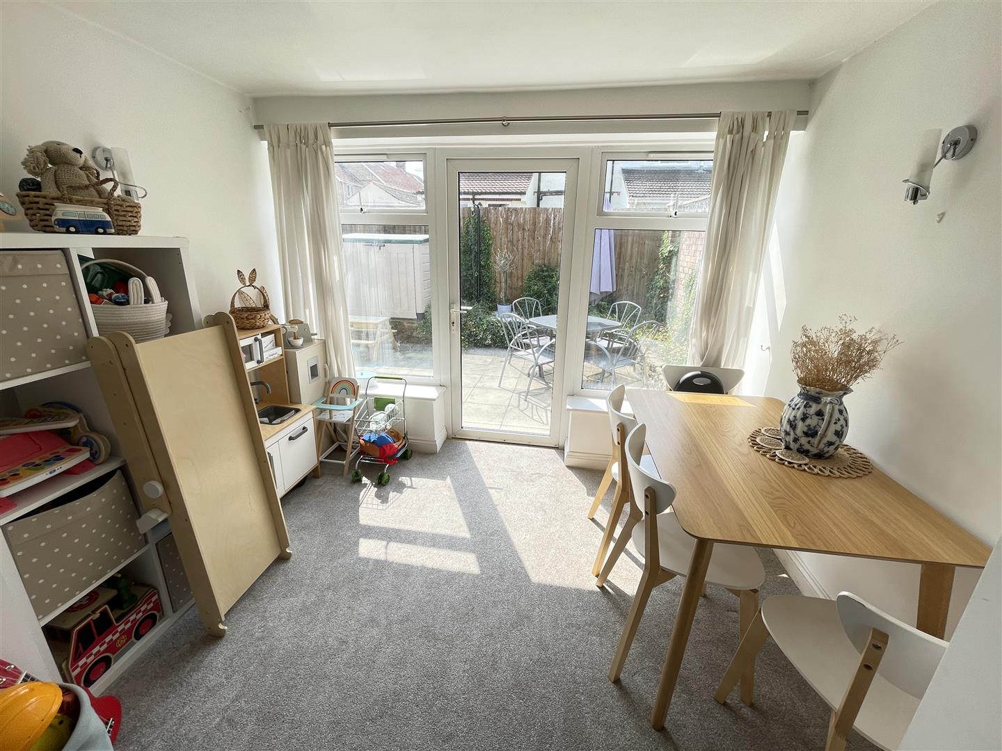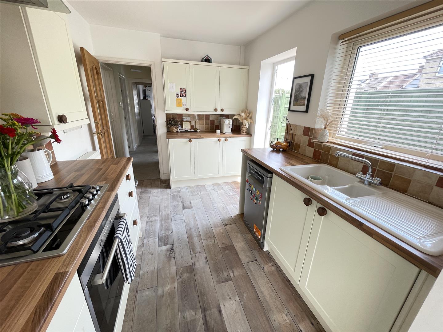 The spacious entrance hall has space for coats and shoes and also a door to the side courtyard offering access for bicycles and gardening. The inner hallway has doors to all the rooms, with bedrooms to the front, bedroom one being a good double and the second being a double. There is then a bathroom with panel bath and electric shower over, hand basin and part-tiled walls. To the side is a separate WC. A door then leads through to the kitchen which is a good size, with a range of work surfaces, base and wall mounted cupboards and drawers, one-and-a-half bowl sink unit with mixer tap over, four ring gas hob with oven under and extractor hood over. Space and plumbing for dishwasher, door to side and rear garden. The utility room has work surfaces with base and wall mounted cupboards, wall mounted Worcester boiler for central heating and hot water, space and plumbing for washing machine, space for tumble dryer. A good sized sitting room then leads through to the dining room with doors to the outside space.