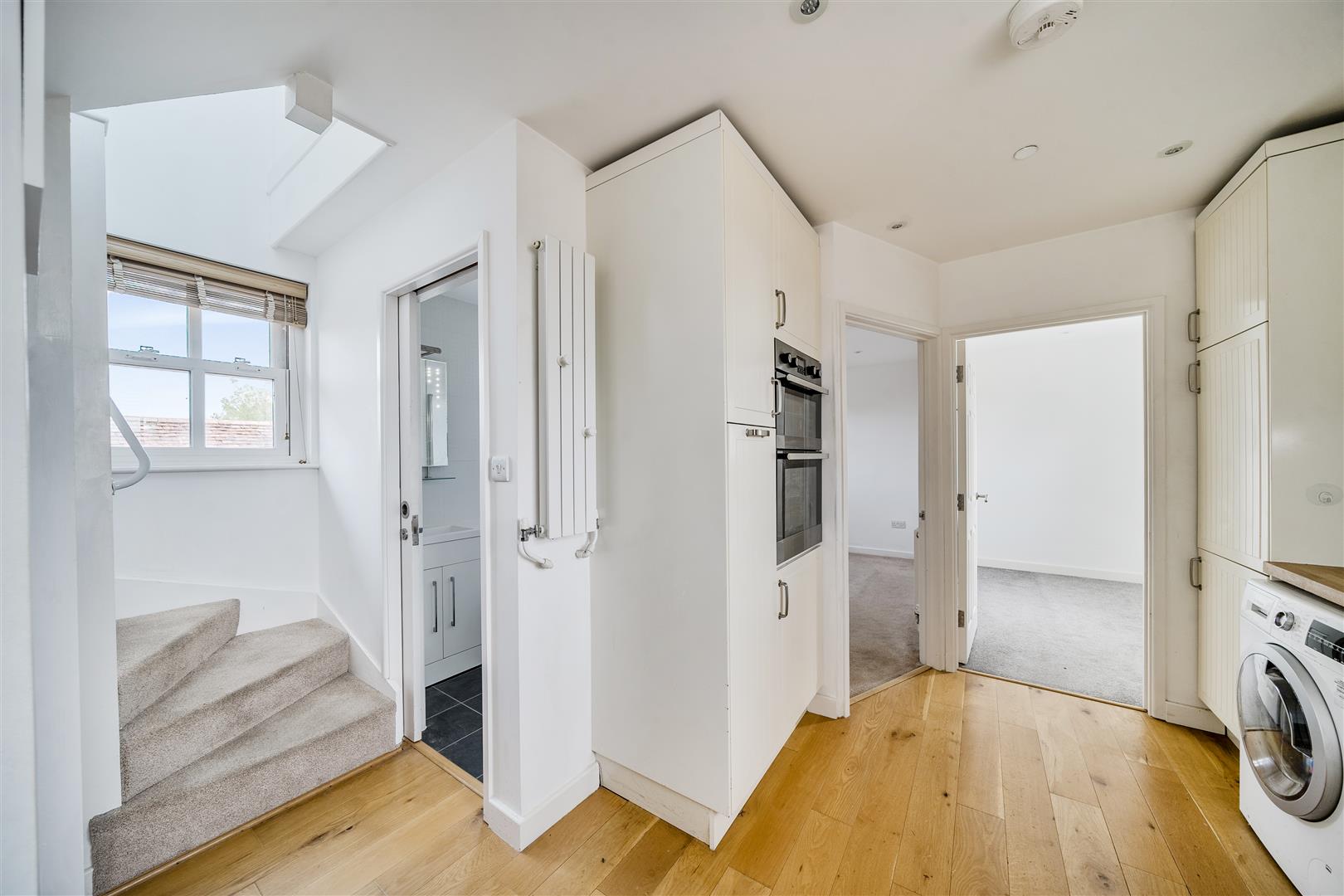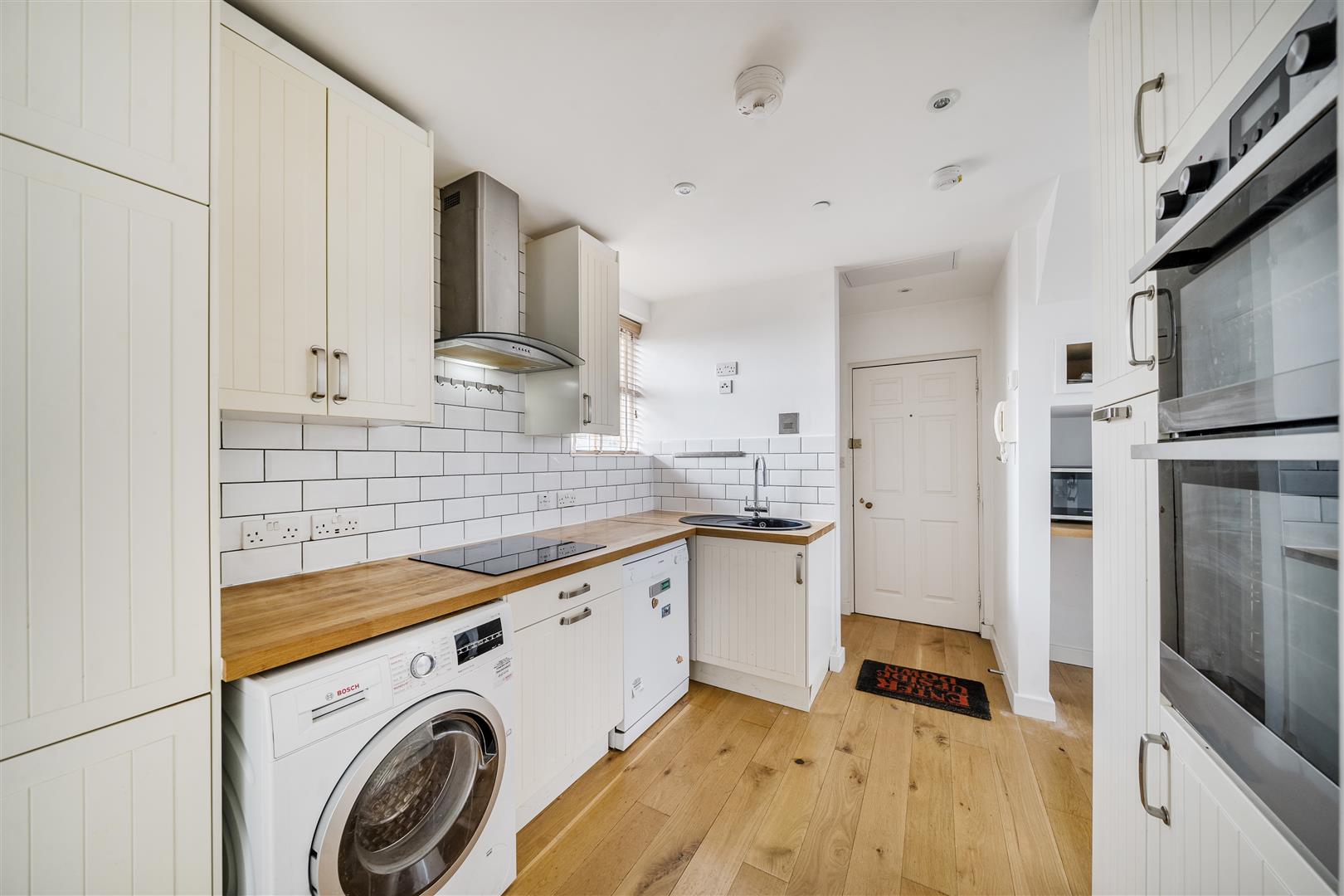 The property is reached via a communal entrance hallway and entrance intercom system. On entering the apartment there is an entrance intercom phone and a useful storage cupboard with shelving. The kitchen has a range of cream fronted units with oak work surfaces together with an integrated oven, grill, four ring hob, extractor and a fridge freezer and a further understair work surface with space for a tumble dryer. The kitchen has a timber floor and a window to the rear and it leads to both bedrooms. The bathroom has a white three piece suite with a cupboard under the basin and a heated towel rail.