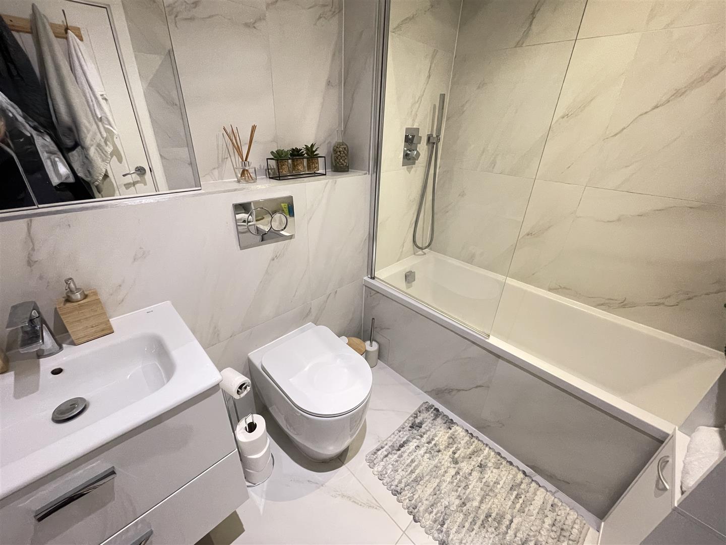 The apartment is approached via steps leading up to a communal hallway with sitting area with another door leading to the inner walkway leading to number 20. The apartment is located to the rear of the block with picture windows from the bedroom and living room onto the large balcony area. The windows are all double glazed and there is electric heating. A private hallway has space for coats and shoes with doors lead off to all rooms. The bathroom has a three piece suite with panel bath and thermostatic shower over with glass protection screen, low level wc with concealed cistern and wash basin with drawers below, tiled walls and ceiling spotlights. The double bedroom has window blind, a door to the balcony and a good recess for storage or wardrobes. The open plan kitchen/living room also has a door to the balcony, wood effect laminate floor, work surface with inset single drainer sink, hob, oven, extractor hood, kitchen cupboards, built in washing machine and window blinds. The balcony has frosted glass screens to sides offering privacy and a good outlook. The parking space is to the rear of the block.