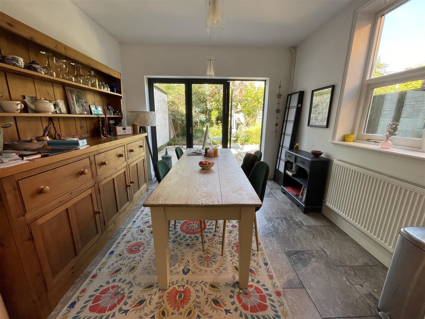 The well proportioned accommodation comprises an entrance hallway with stairs leading to the first floor. The sitting room has an attractive bay window, a ceiling rose and a feature fireplace. The dining room has an original built in dresser with glass fronted display shelving, a further feature fireplace and French doors leading to the rear garden. The layout has been altered to provide a large, light and airy kitchen/dining room which has an excellent range of units, a built in gas oven, space for both a washing machine and dishwasher and a fridge/freezer. The dining area has attractive Tri-fold doors leading out on to the rear garden and this room makes for a great entertaining space.