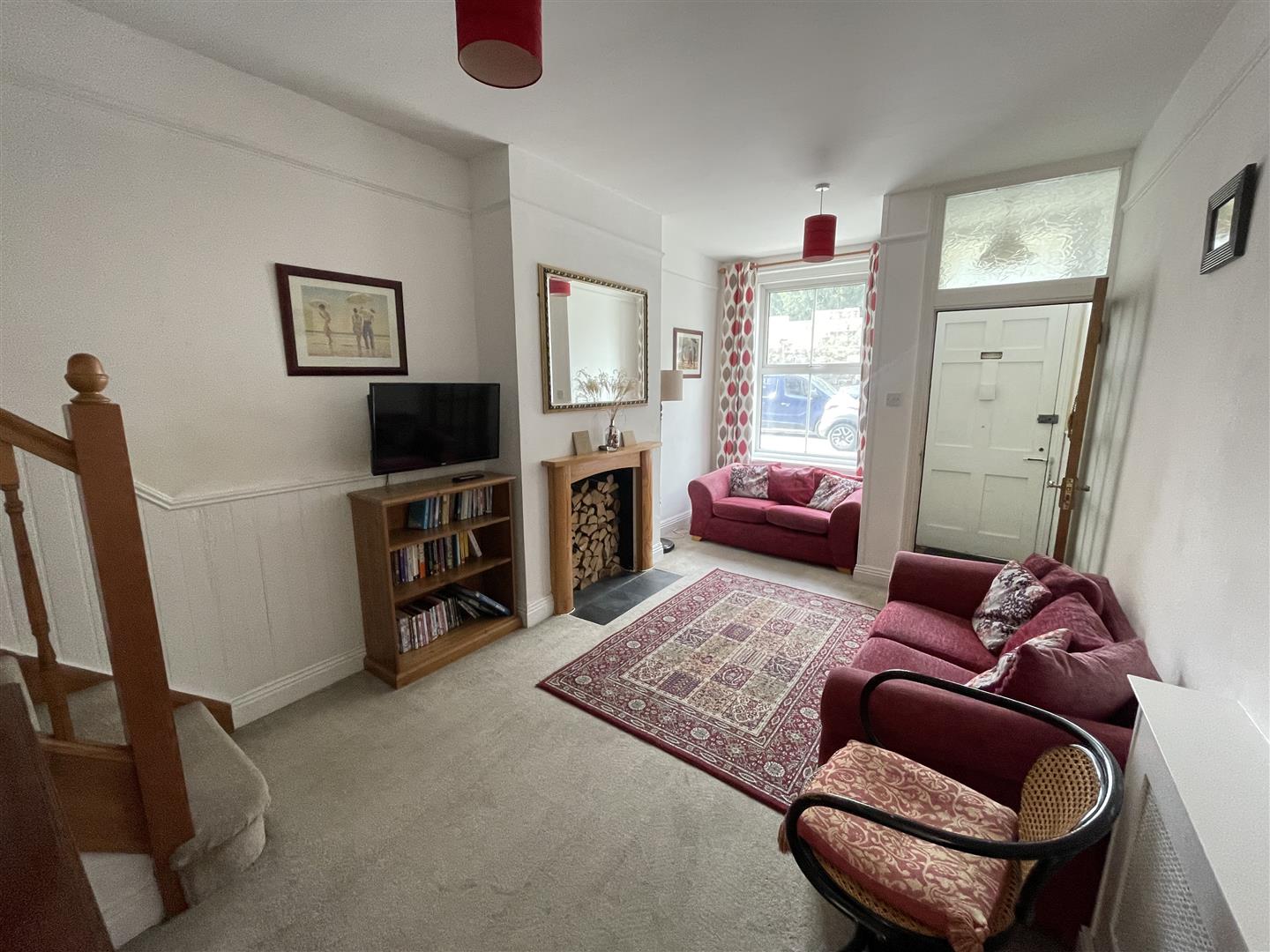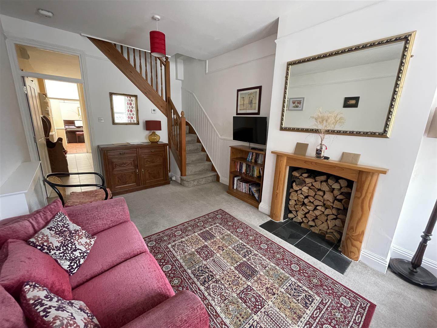 On the ground floor, an entrance lobby leads into a cosy sitting room with a feature fireplace and timber surround – the perfect spot to relax. The kitchen/breakfast room is fitted with a generous range of units, a Range-style cooker with induction hob, and space for everyday appliances, with room for a dining table too. Beyond, a bright dining room provides extra living space and useful storage, with both rooms enjoying practical tiled flooring.