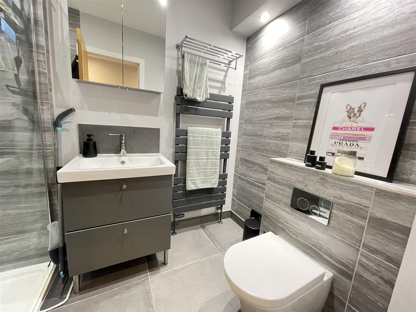 On the first floor, the landing has access to a part boarded and insulated loft area. The main bedroom overlooks the rear garden and the second bedroom has a cupboard with shelving that also houses the Vaillant gas boiler. The bathroom has a contemporary white suite with a large shower area, a wash basin with cupboards under and a mirrored wall cabinet. The floor is fully tiled and there are attractively part tiled walls.