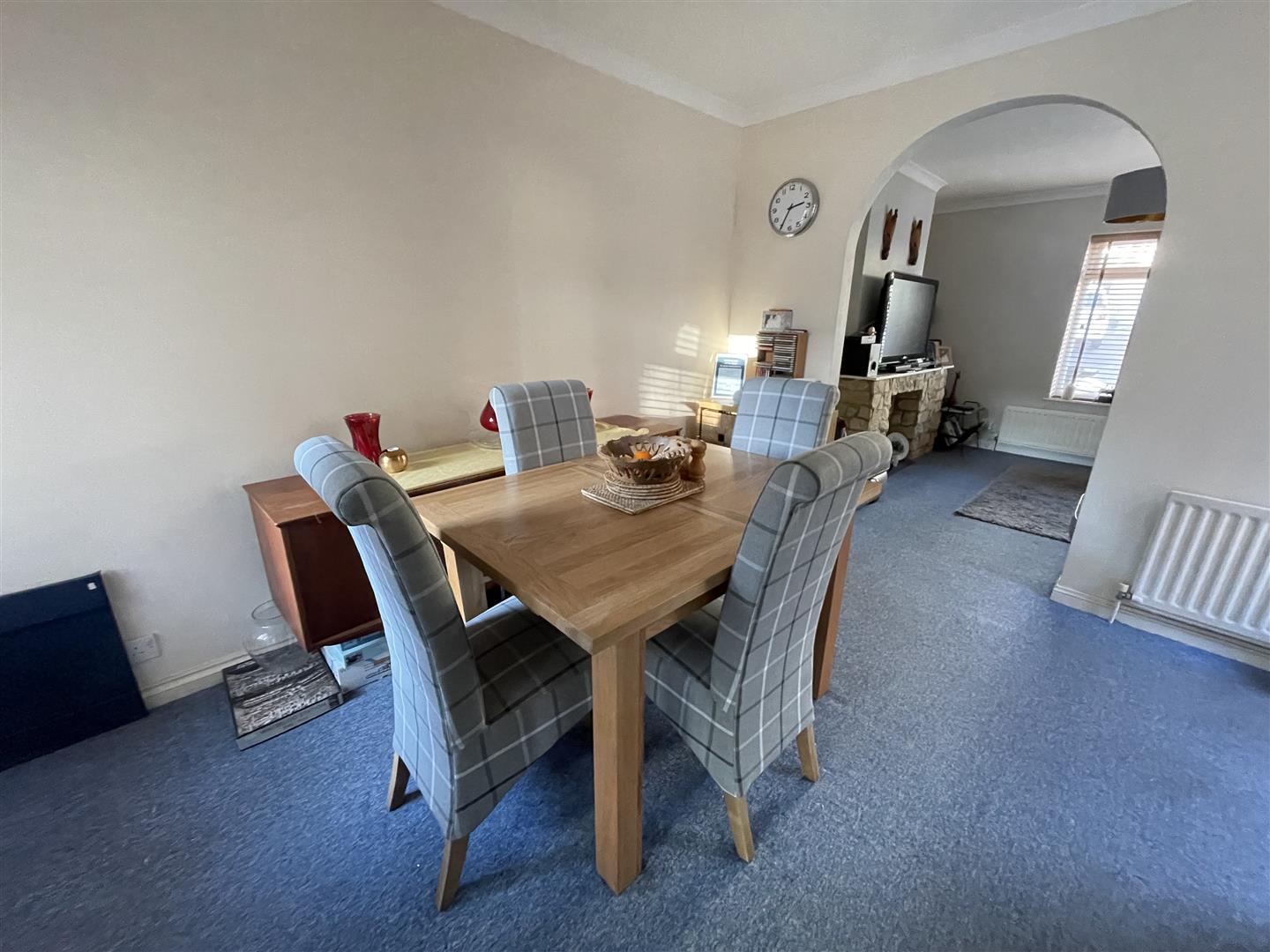 The accommodation comprises a sitting room which has a double aspect and a stone fireplace with an inset electric fire. This leads to a dining room which has stairs to the first floor and useful storage under.